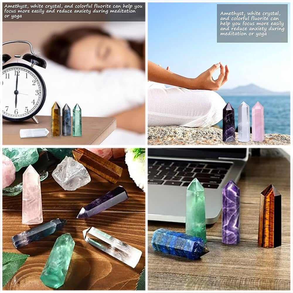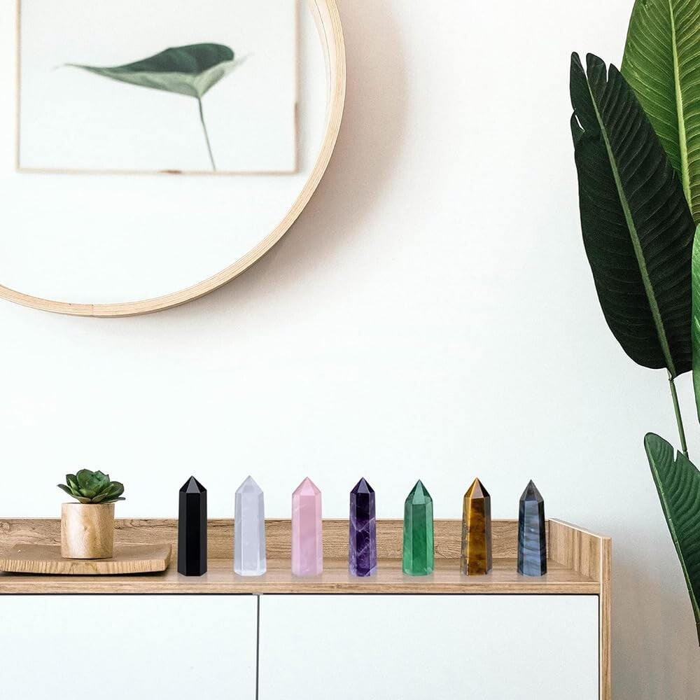 - 【Materials】Contains 7pcs natural crystal pillars (Obsidian, Rose quartz, Amethyst, Green fluorite, Tiger's Eye stone, White crystal, Labradorite)